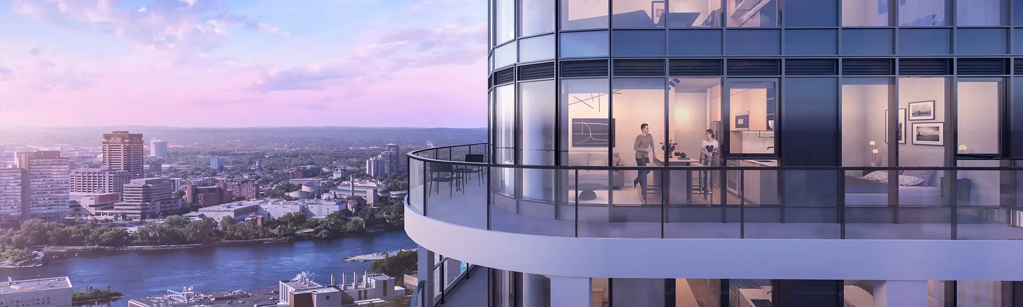 Elegantly designed, the 23- and 29- storey apartment towers rise above a two-storey podium, seamlessly integrating ground-floor retail spaces and street connectivity. The artfully sculpted design offers a refined urban living experience in Ottawa’s downtown district.